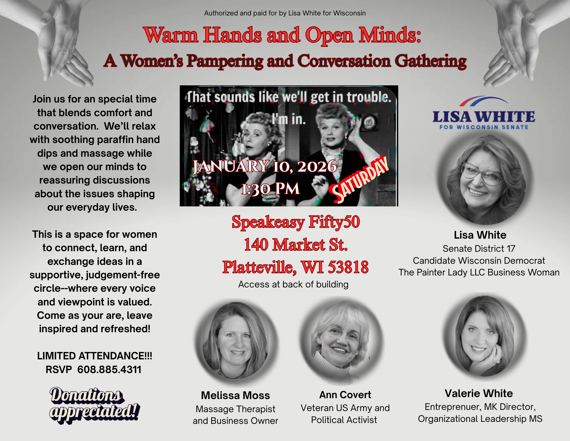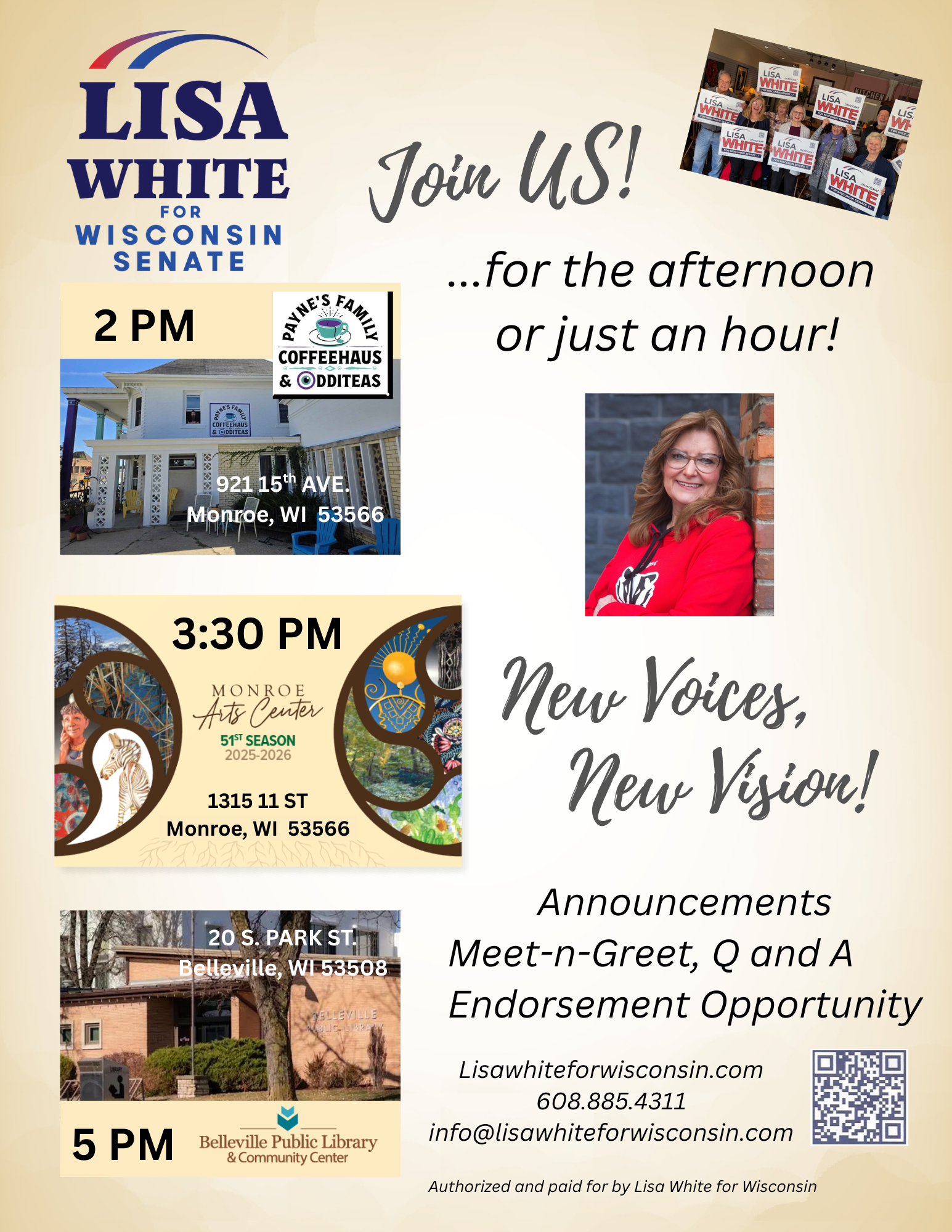Support Wisconsin District 17 Senate candidate Lisa White in her journey to bring positive change to our community! Your generous donation will help fund her campaign, ensuring she can connect with voters, spread her message, and fight for the issues that matter most to our families. Every contribution, no matter the size, makes a difference in building a brighter future for Wisconsin.